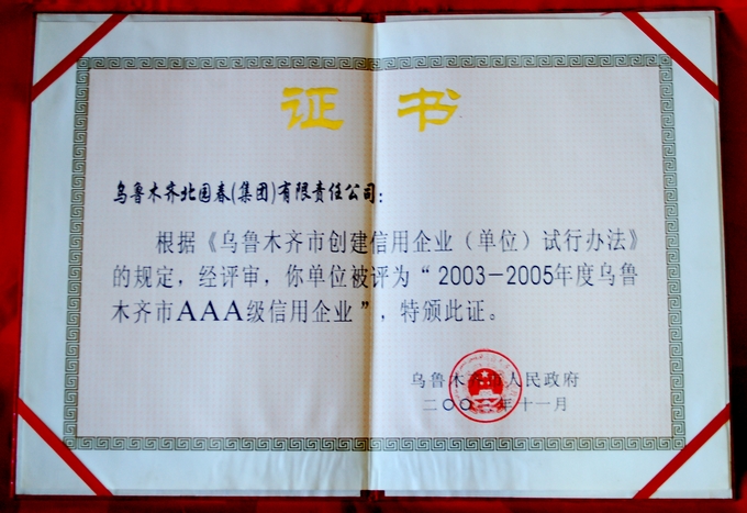 2003年11月,北园春集团公司被乌鲁木齐市人民政府评为“2003—2005年度乌鲁木齐市AAA级信用企业”。