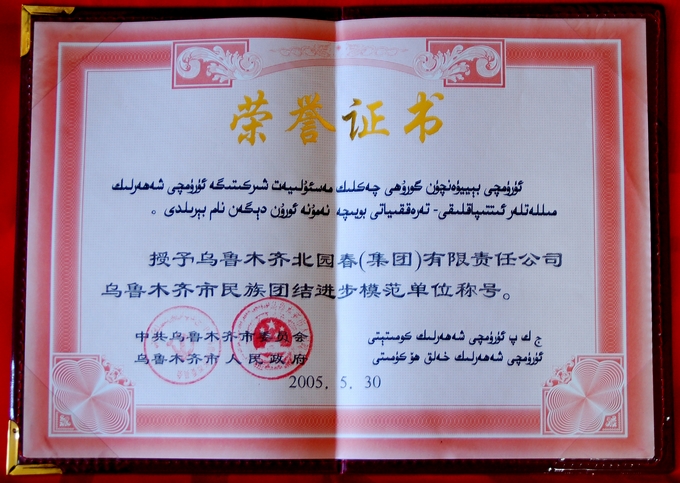 2005年5月,北园春集团公司被乌鲁木齐市人民政府授予“乌鲁木齐市民族团结进步模范单位”称号。