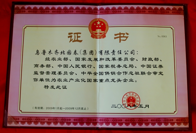2008年5月,北园春集团公司第四次被农业部、国家发展和改革委员会、财政部、商务部等单位联合审定为“农业产业化国家级重点龙头企业”。