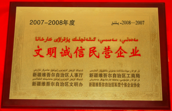 2010年6月,被新疆银行业协会评为2008-2009年新疆银行业“信贷诚信企业客户”荣誉称号。(文件及证书)