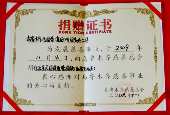 2009年11月,北园春集团公司向乌鲁木齐慈善总会捐款50万元作为社区基层建设维稳专项资金。